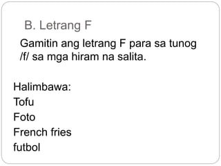 Letrang F Gamitin ang letrang F para sa tunog f sa mga hiram na salita. Mais mangga mata mapa manika medalya medyas mesa mani manok makopa. MalacaŇang La niŇa b.