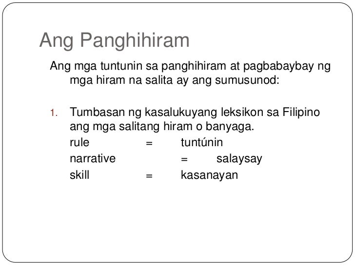 Mga Salitang Hiram sa Wikang Hapones Jack-en-Poy This Filipino word is from the Japanese じゃんけんぽん jankenpon which is the game known in English as rock-paper-scissors. Oliverio MATF Instructor Father Saturnino Urios University Mgasalitang hiramsa ingles. Mga Salitang Hiram sa Latin Filipino words from the Latin language Mga Salitang Hiram sa Latin sa pamamagitan ng Ingles o Kastila.