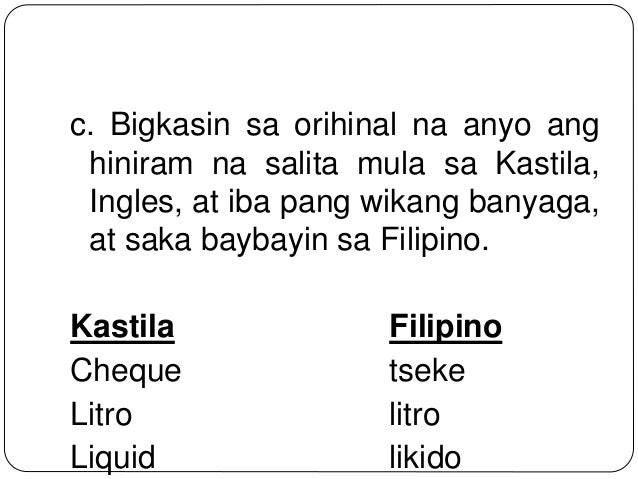 Iniaayon sa bigkas ng salitang Kastila ang pagbaybay sa Filipino. Hiram na salita Filipino Rule tuntunin Ability. Laganap ang paggamit ng mga hiram na salita dahil mas napapadali or mas kilala ito sa lahat nga mga pilipino.